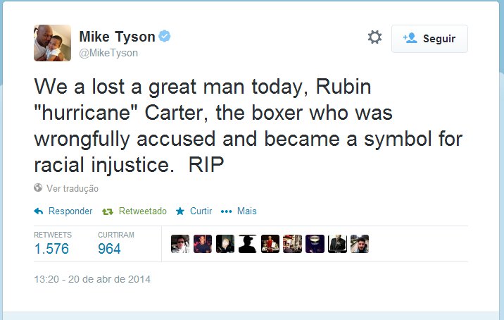 E o ex-campeão mundial dos peso-pesados, Mike Tyson, registrou sua homenagem no Twitter: “Perdemos um grande homem hoje, Rubin ‘hurricane’ Carter, o pugilista que foi equivocadamente acusado e se tornou um símbolo da injustiça racial. RIP”