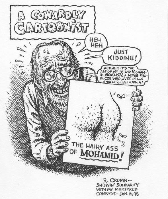Sobre o caso da Charlie Hebdo em si, Crumb lembra que a revista é famosa por insultar não apenas muçulmanos, mas também cristãos, judeus, o Papa, o presidente, não importa. E que não existe nos EUA uma revista parecida (a MAD não chega nem próximo do que a Charlie faz), por isso é tão difícil os americanos entenderem essa lógica – que é uma tradição na França. Crumb afirma ainda que o estilo da revista francesa não é bem o seu (ainda que ele tenha provocado sérias discussões sobre a visão de racismo e feminismo que aplicava em seu trabalho), mas que depois das mortes, resolveu fazer um cartum em homenagem às vítimas, ainda que de maneira totalmente ‘crumbeana’, digamos assim. Ou seja, dá a pancada, mas deixa uma brecha ‘covarde’, como ele mesmo admite.